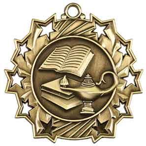 Lamp of Knowledge 2 1/4" medal with 10 star edge and highly detailed artwork. Available in gold. (Silver and bronze are available by special order; please contact us directly for more information.) Your choice of pin drape or neck ribbon.