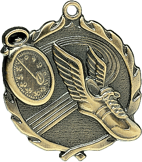 Highly detailed Track medal with wreath border and 3D look. Available in gold. (Silver and bronze are available by special order; please contact us directly for more information.) Your choice of pin drape or neck ribbon.