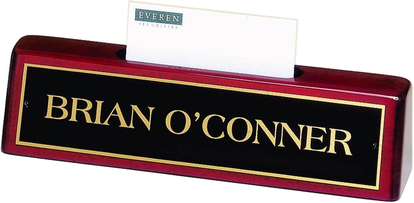Highly polished rosewood piano finish desk name plate with business card holder.