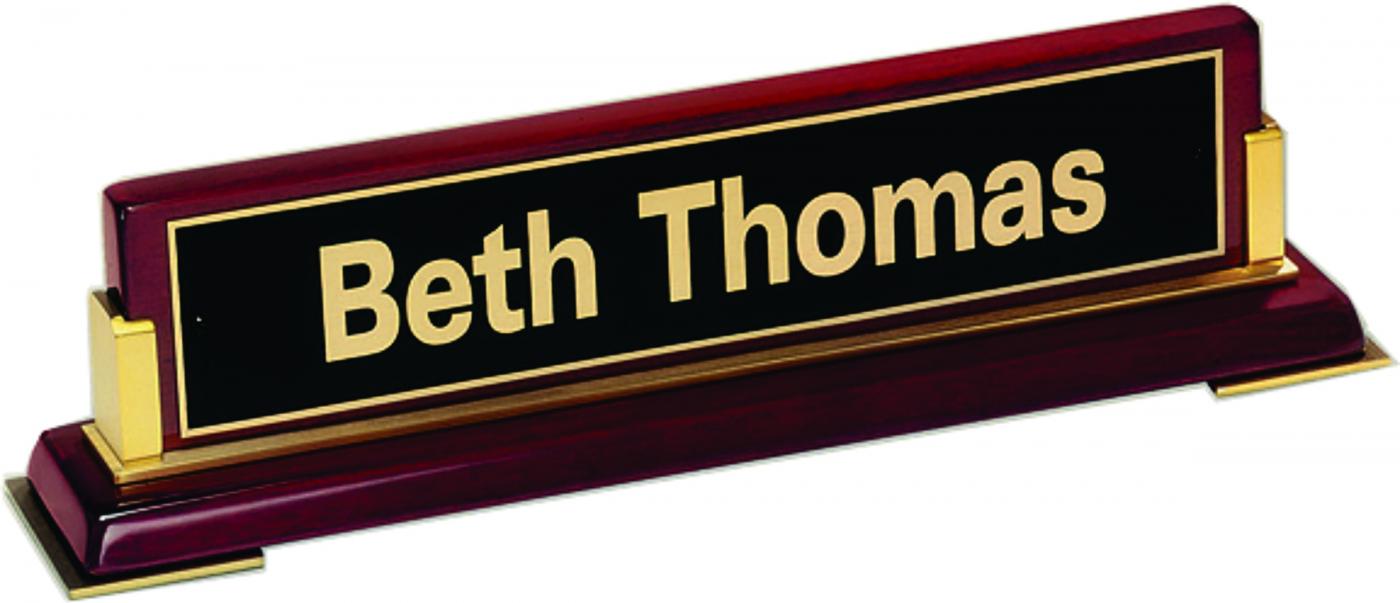 Elegant piano finish cherry finished desk name plate with brass accents and black engraving plate.