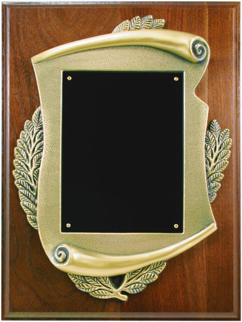 Classic metal scroll casting on a solid black walnut plaque board with black brass engraving plate.