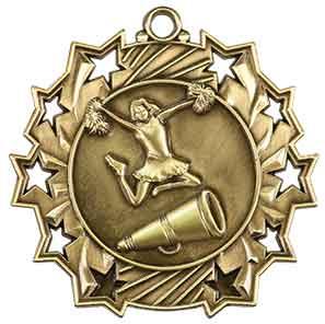 Cheerleading 2 1/4" medal with 10 star edge and highly detailed artwork. Available in gold. (Silver and bronze are available by special order; please contact us directly for more information.) Your choice of pin drape or neck ribbon.
