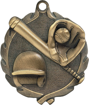 Highly detailed baseball medal with wreath border and 3D look. Available in gold. (Silver and bronze are available by special order; please contact us directly for more information.) Your choice of pin drape or neck ribbon.